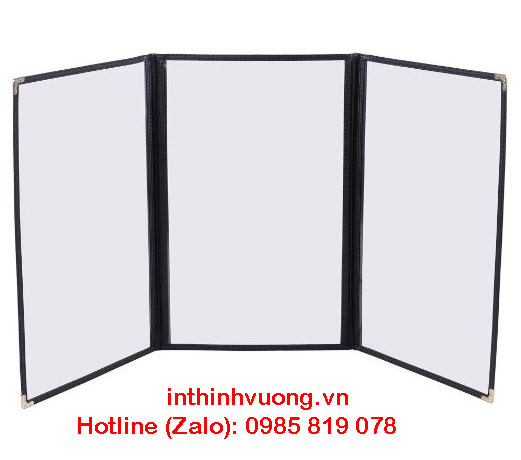Sản phẩm có nhiều kiểu dáng như: vỏ menu 2 lá ( tức là chỉ để được 2 tờ menu), vỏ menu 4 lá, vỏ menu 6 lá, ...vỏ menu gập 3. Kích thước và số lá thiết kế theo yêu cầu.